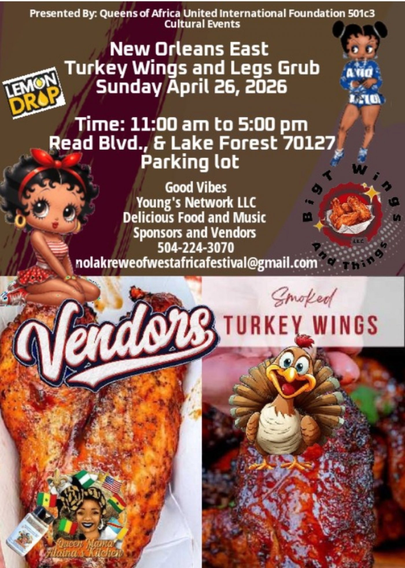 Get ready to feast at the New Orleans East Turkey Wings, Legs Grub with sweet Lemon Drop Beverages Sunday April 26, 2026! It's an in-person event where you can enjoy a variety of mouth-watering turkey wings and legs, all in a fun, laid-back atmosphere. Bring your friends, come hungry, and savor some delicious eats while soaking up the vibrant local Music vibes and Entertainment. Don't miss out on this tasty celebration right in the heart of New Orleans East!