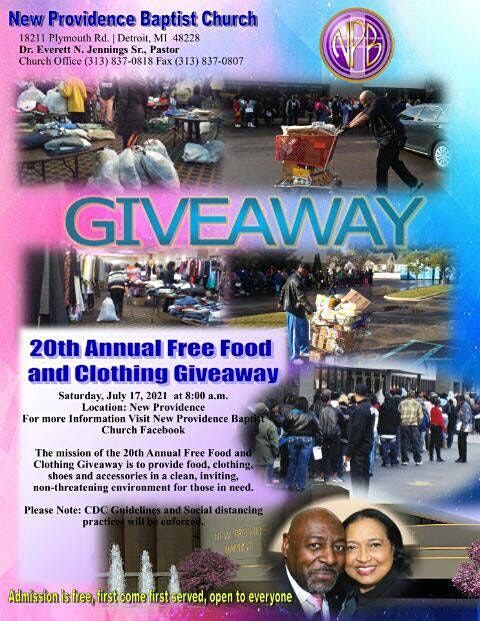 On Saturday, July 17, 2021 at 8:00 a.m. New Providence Baptist Church and Forgotten Harvest will feed and clothe Metro Detroit families in need for FREE. In addition, City of Detroit Health Department will provide covid 19 vaccine (walk ins welcome) and Detroit Police Department will donate gun locks to families in attendance.