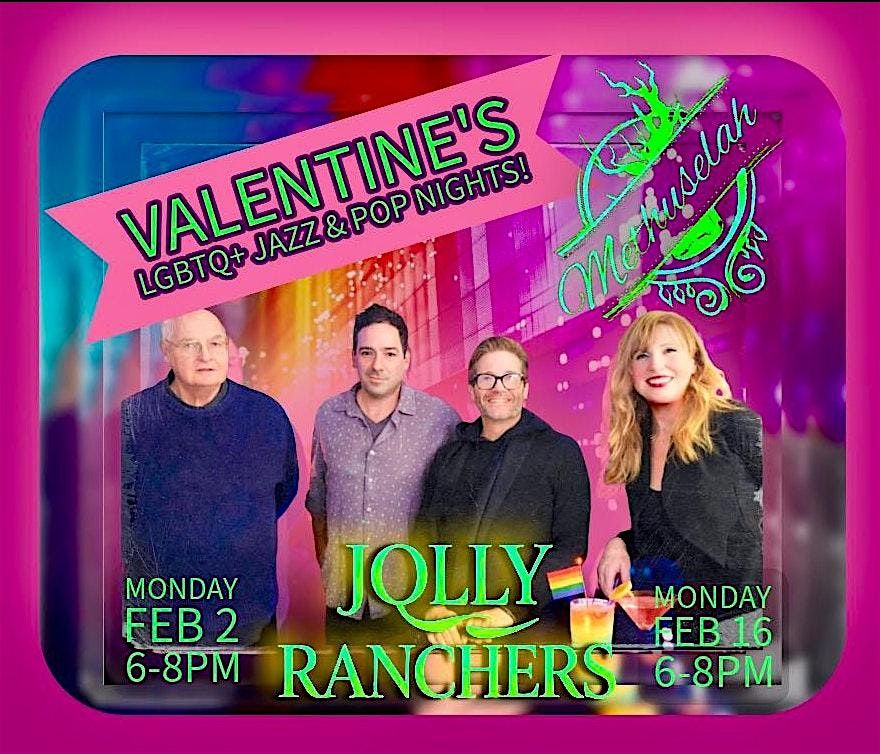 Celebrate Valentine Mondays Feb 2 & 16, 2026 6-8 pm with the Jolly Ranchers: Ron Ramsay; Vocals, Eileen Markland Violin, Charlie Tokarz Woodwind, Benny Kohn Keyboards. No cover charge. Finally the queer community has a reason to come in out of the cold and warm your heart & body with great music, great company, great drinks & surprisingly creative edibles.