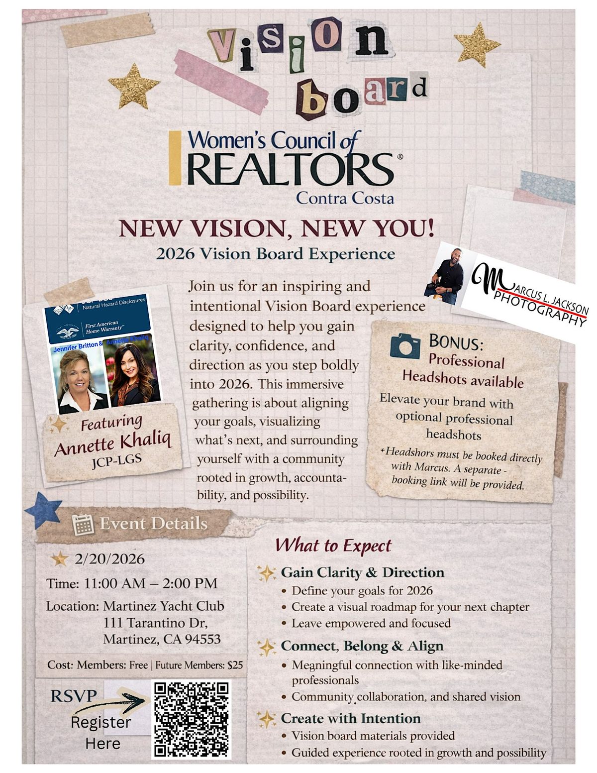 Ready to kick off 2026 with a fresh outlook? Join us in person for a fun, creative session where you’ll craft your dream board to visualize your goals and dreams for the year ahead. Generously sponsored by Annette Khaliq of JCP-LGS and Jennifer Britton of First American Home Warranty. This event is FREE for Women's Council of Realtors Contra Costa members and $20 for future members.