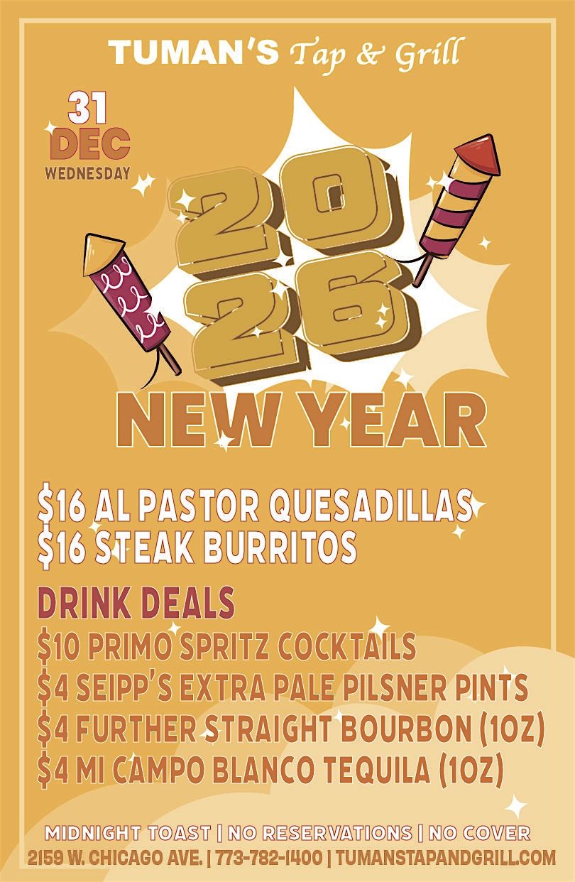 Enjoy a hassle-free New Year’s Eve with the regular a la carte food and drink lineup, plus festive holiday specials. The bar is featuring $16 Al Pastor Quesadillas (with house salsa and sour cream), and $16 Steak Burritos (with house salsa), plus drink deals such as $10 Primo Spritz cocktails, $4 Seipp’s Extra Pale Pilsner pints, $4 Further Straight Bourbon (1oz) and $4 Mi Campo Blanco Tequila (1oz). Tuman’s offers expanded hours Wednesday, December 31; the bar is open from 4 p.m.-2 a.m. (normally open until midnight). No cover charge; no reservations.