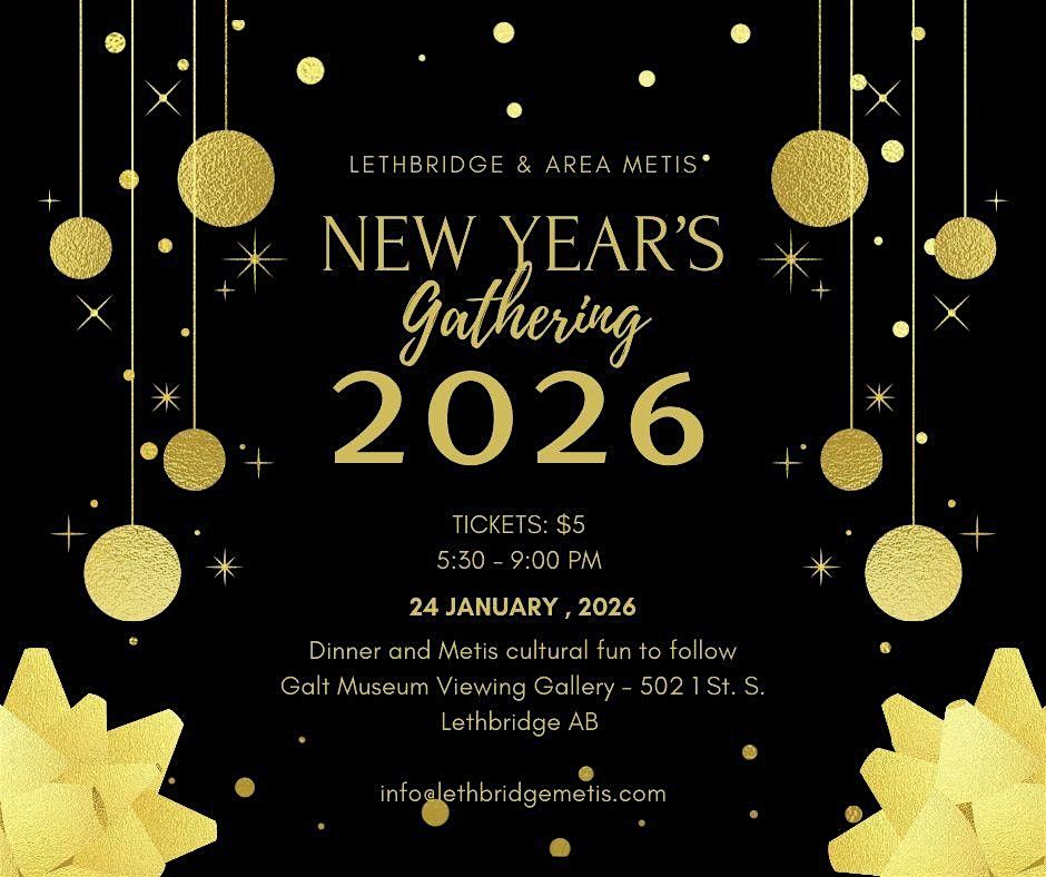 Join us for our New Year’s Party on January 24 from 5:30 PM to 9:00 PM at the Galt Museum Viewing Gallery in Lethbridge. This family‑friendly evening will feature food, prizes, and Métis cultural activities in a welcoming community setting. Each attendee must register individually through Eventbrite, and tickets are $5 per person. We look forward to celebrating the New Year together.