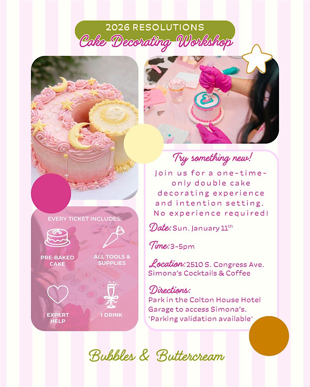 Join us at Simona's Cocktails & Coffee for a fun-filled evening of cake decorating. Whether you're a beginner or a pro, this event is perfect for anyone who loves getting creative with desserts. Grab your friends and unleash your inner pastry chef as you decorate delicious cakes together. Don't miss out on this sweet celebration!
