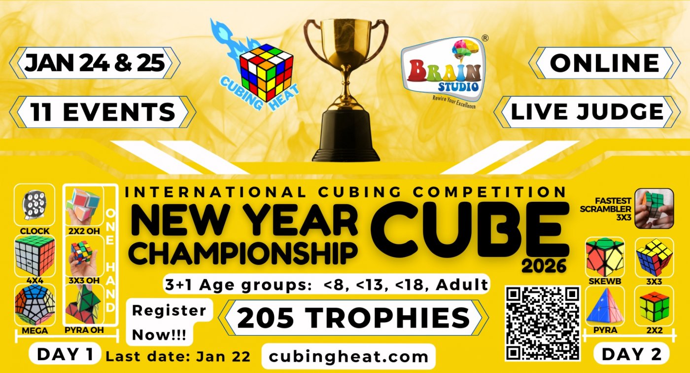 Start your year with a big win at our international online cubing championship! Whether you are a beginner or a pro, join us for a weekend of speed, skill, and 1-on-1 live judging.