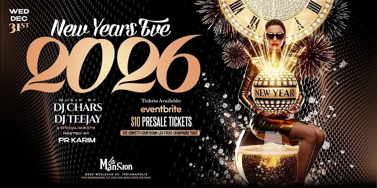 Join the most epic New Year's Eve celebration and usher in 2026 on December 31st at La Mansion Nightlife! 🎆 Secure your spot with $10 presale tickets, available in limited quantities on Eventbrite. Enjoy a night of revelry with confetti, 360 photo booth, LED sticks, CO2, live countdown, champagne toast at midnight, and bottle specials. Groove to the beats of DJ Teejay, DJ Chars, and guests, hosted by PR Karim. New Year's accessories available at entrance.Free Parking Available Secure Lot. Bottle specials are available all night. Appetizers are available throughout night. Reserve your VIP or free table by texting 317-439-2092 or 765-278-5628.