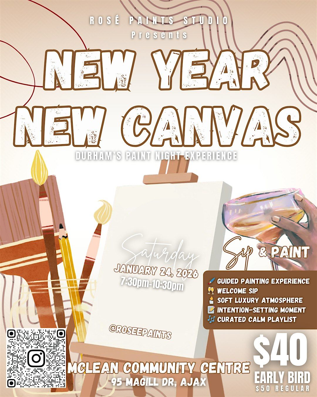 New Year, New Canvas: a calm, luxury paint & sip in Ajax. Set intentions, sip rosé, and create art in a relaxed, guided experience.