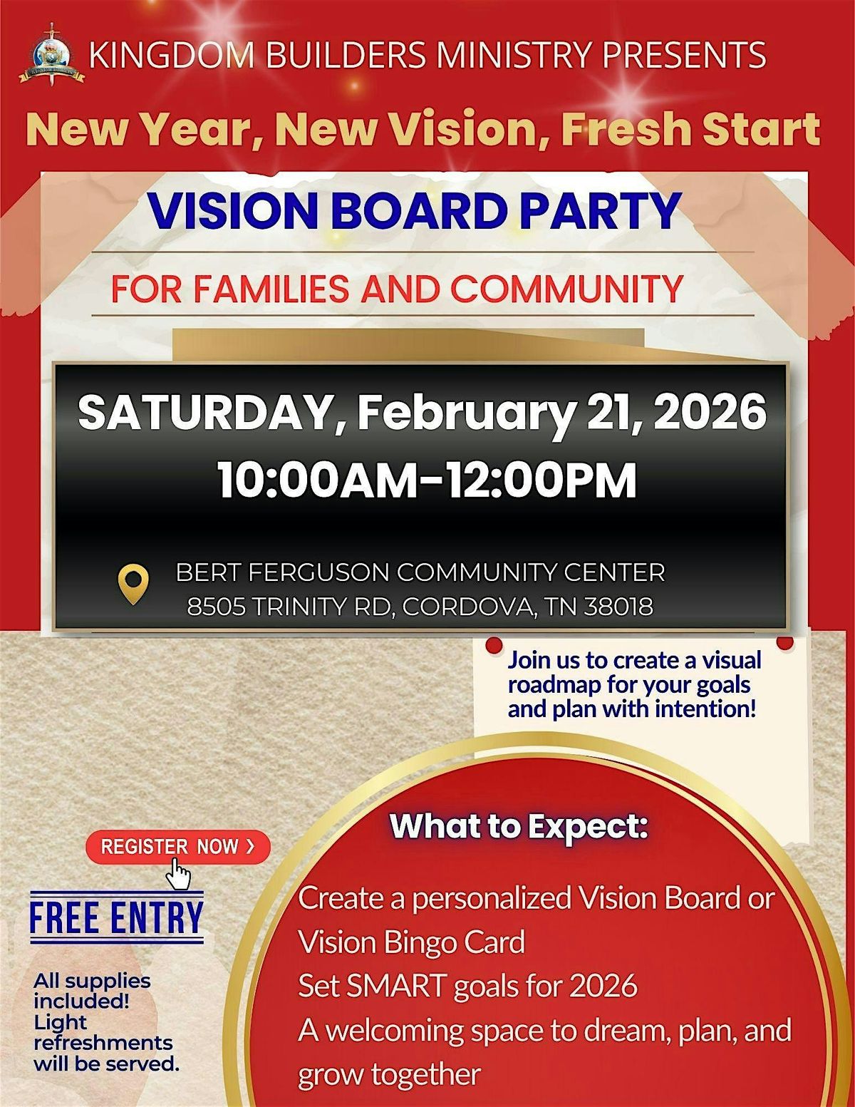 Kick off the year right at our New Year, New Vision, Fresh Start Vision Board Party! This in-person event is all about dreaming big and setting your goals while having a blast. Bring your creativity and let's craft vision boards that inspire and motivate. Perfect way to make your new year truly bright and bold!