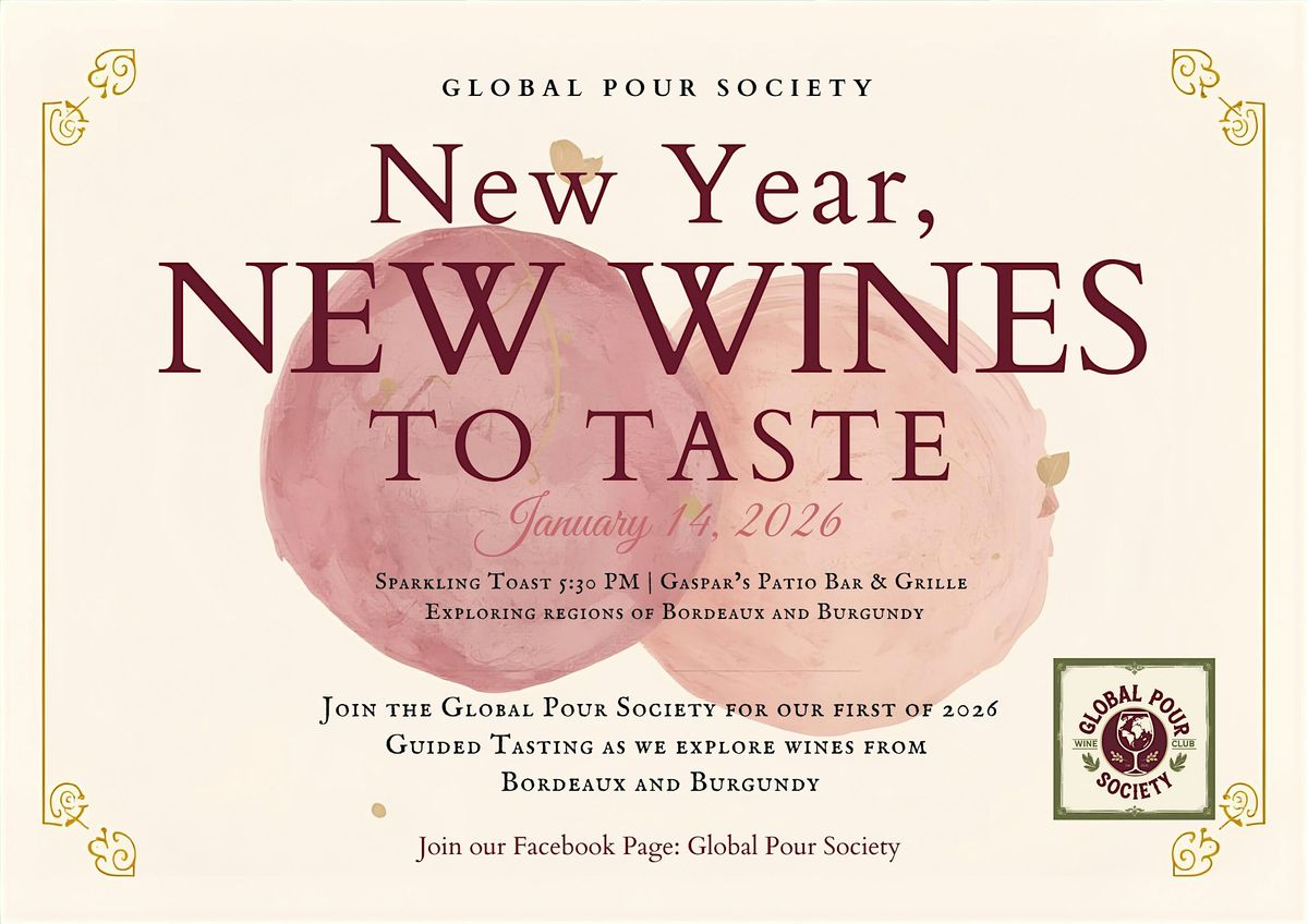 Join the Global Pour Society for our first Wine Tasting of 2026! We'll be traveling to Bordeaux & Burgundy to explore the region and wines.