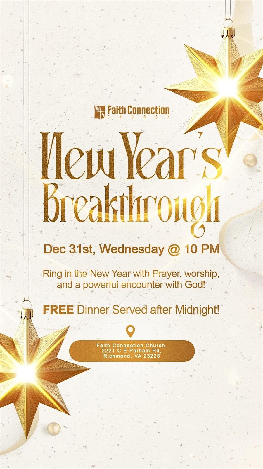 Ready to kick off the new year with a bang? Join us in person at Faith Connection Church for an amazing event that’ll set your tone for 2026. Ring in the New Year in the presence of GOD with worship, prayer, a powerful Word and prophetic declarations for the New Year! This is the BEST WAY to enter the new year!