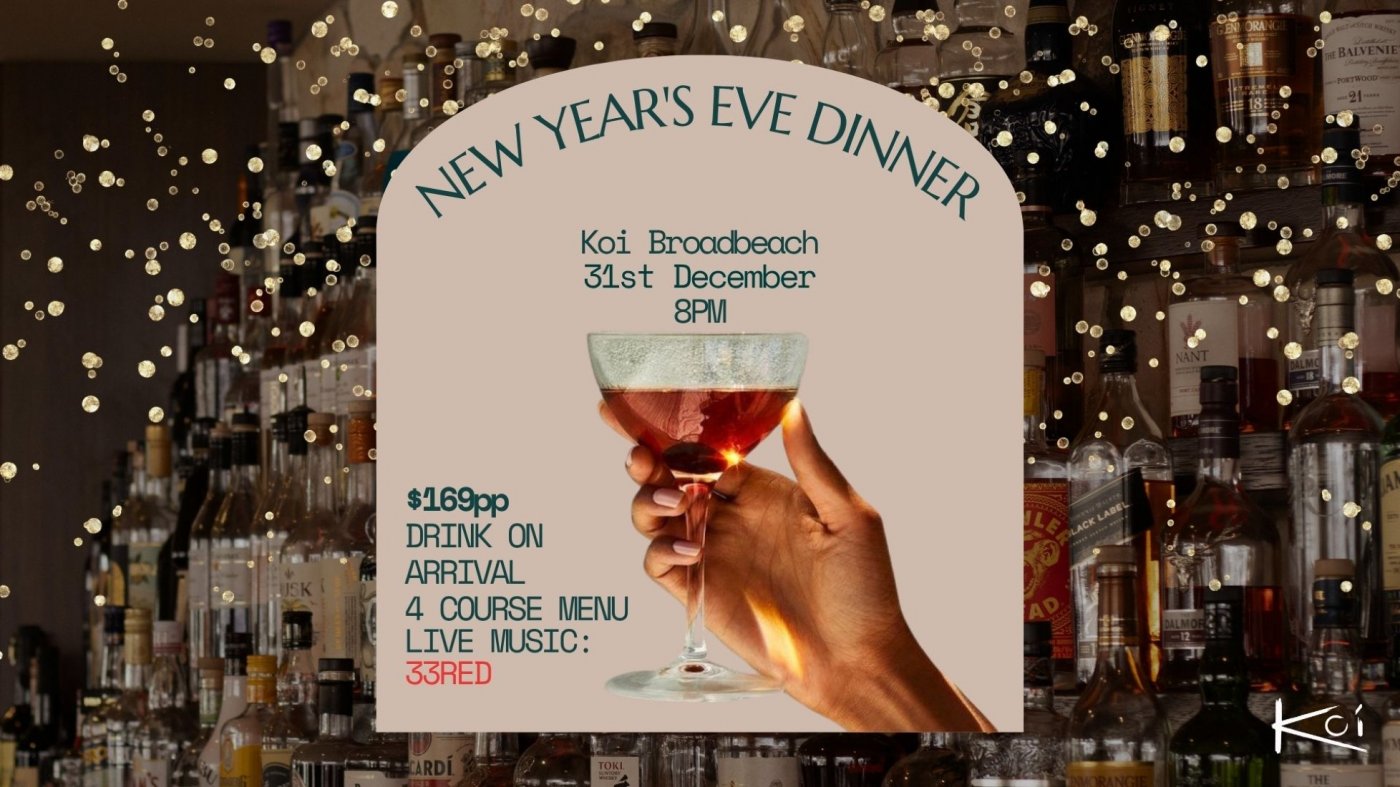 Celebrate New Year’s Eve in Broadbeach at Koi Dining & Lounge Bar the ultimate Gold Coast destination for food music and atmosphere. This year Koi will come alive with an exclusive four-course New Year’s Eve dinner and live performance by 33Red — all for $169 per person — bringing the perfect energy to welcome 2026 in style.