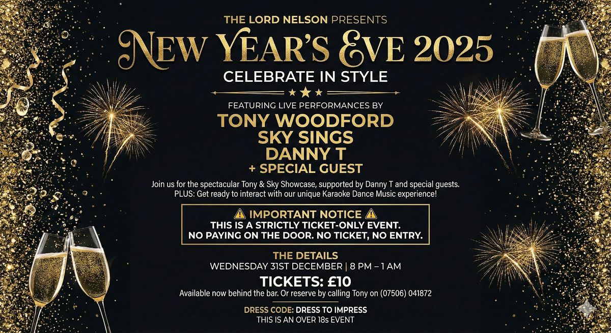 This New Year's Eve at the Lord Nelson a night of uplifting entertainment starting the night with sky sings and her amazing show moving onto live DJs of Tony Woodford and Danny T not forgetting Tony Woodford and sky sings performing their live showcase!!