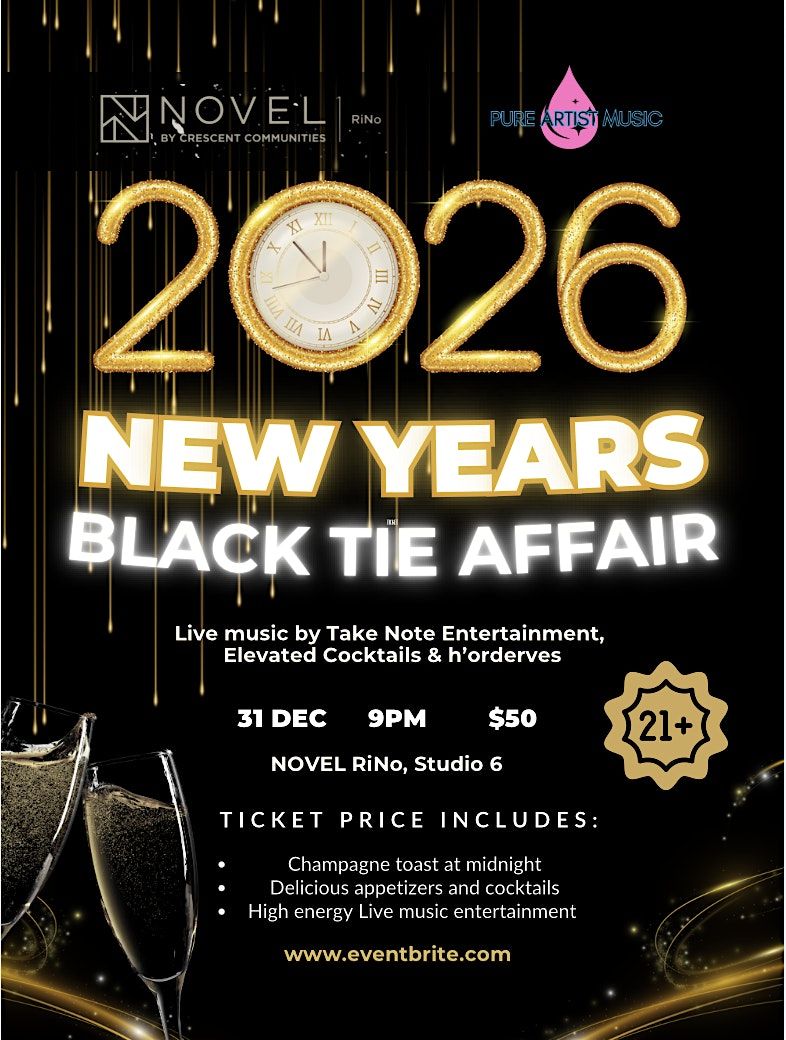 Welcome to the New Years Eve Black Tie Affair at NOVEL RiNo! Get ready to ring in the New Year in style on December 31, 2025 at 9:00 PM. Put on your finest attire and join us for a night of celebration and fun. Let's welcome the new year together with great music by Take Note Entertainment, delicious drinks, elevated bites and good company. Don't miss out on this glamorous event! See you there!