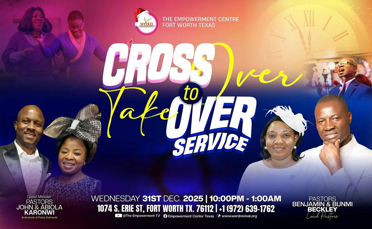 As we stand at the doorway between one season and another, The Empowerment Center invites you to a powerful Cross Over to Take Over Service. This is a sacred moment set aside to close the year with gratitude, worship, and intentional prayer, while stepping boldly into the new season with clarity and faith.