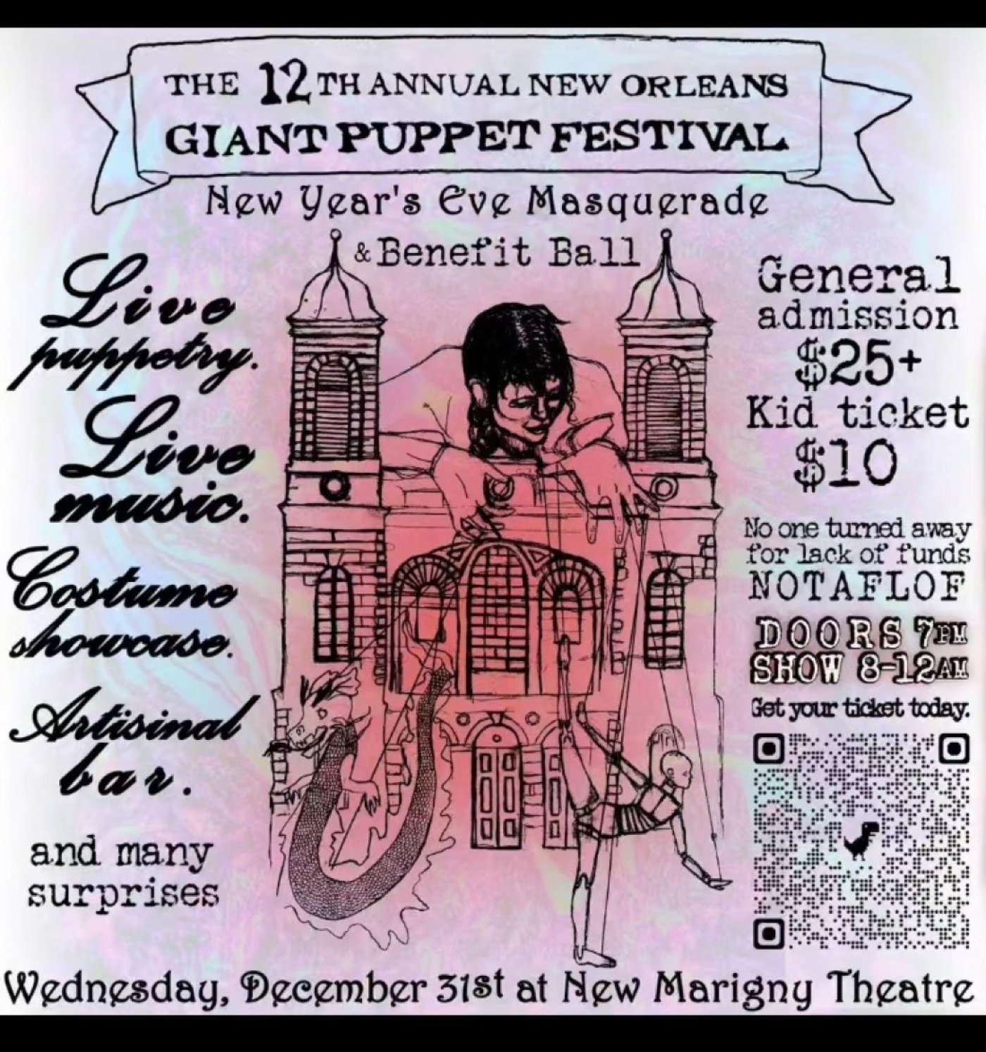 Tickets available here or at the door: https://www.neworleansgiantpuppetfest.com/ticketsandmerch/p/ticket-to-the-new-orleans-giant-puppet-festival-new-years-eve-masquerade-and-benefit-ball