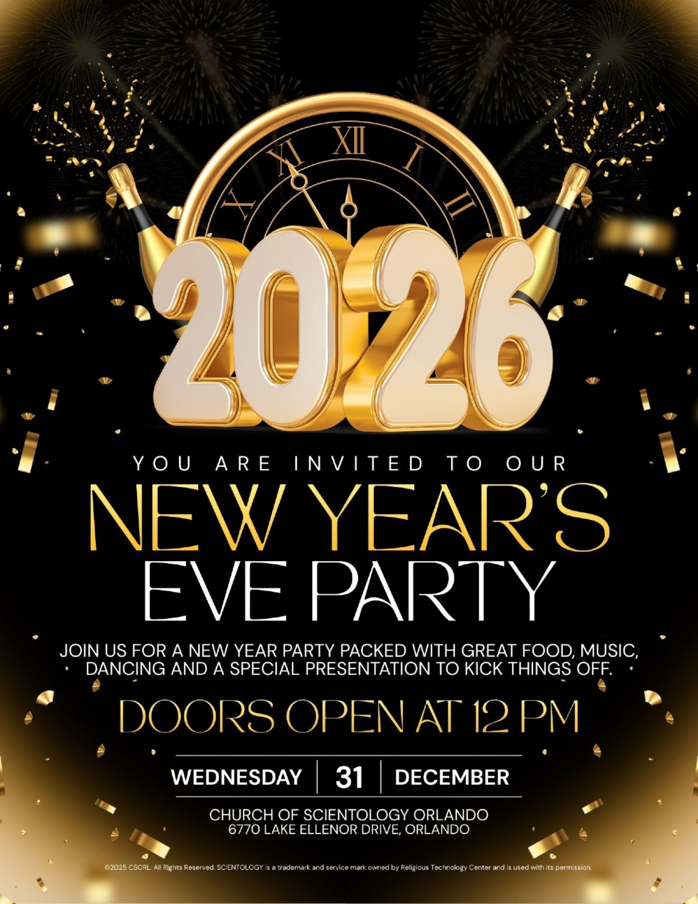 Celebrate the countdown to a spectacular New Year at the New Year's Eve Party hosted by Church of Scientology Orlando! π