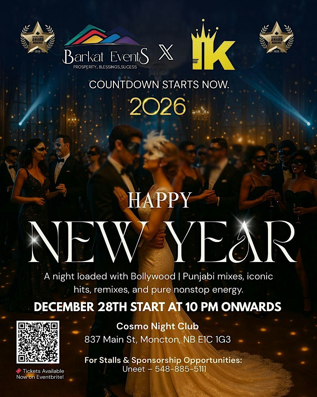 #BarkatEvents #NewYears2026 #MonctonEvents #MasqueradeNight #NYEParty #CanadaEvents #BollywoodNight #PunjabiNight #ClubNight #EventbriteCanada #MonctonNightlife #PartyInMoncton #CosmoNightClub