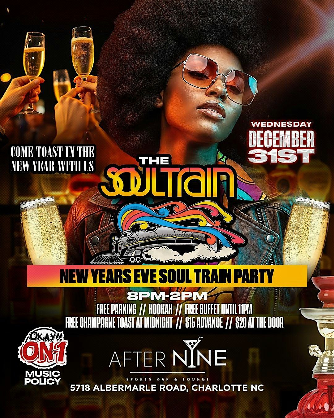 #NYECharlotte #SoulTrainParty #AfterNineCLT #NewYearsEveVibes #freeparking #VIPSECTIONS #DRINKSPECIALS