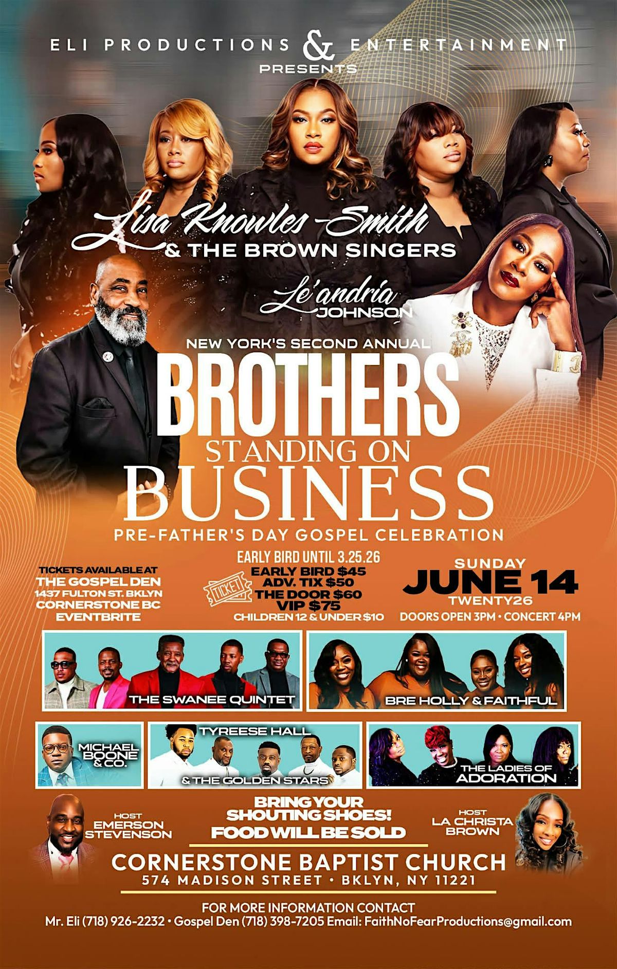 Featuring: Lisa Knowels Smith and the Brown Singers Le Andria Johnson The Swawnee Quintet Michael Boome and Co. Bre Holly and Faithful Tyresse Hall & Golden Stars and The Ladies of Adoration