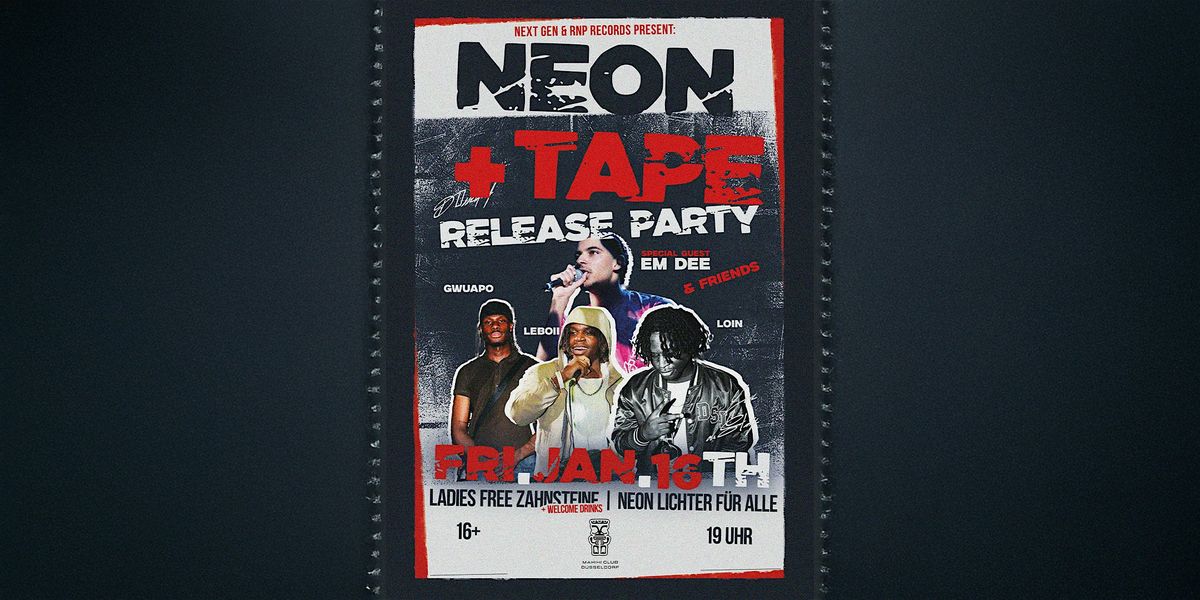 Die NEON + TAPE RELEASE PARTY – eine Nacht, die wir gemeinsam mit euch feiern wollen. Musik, Energie und leuchtende Neon-Vibes treffen auf echtes Club-Feeling. Sei Teil davon und erlebe einen Abend, der verbindet, bewegt und in Erinnerung bleibt.