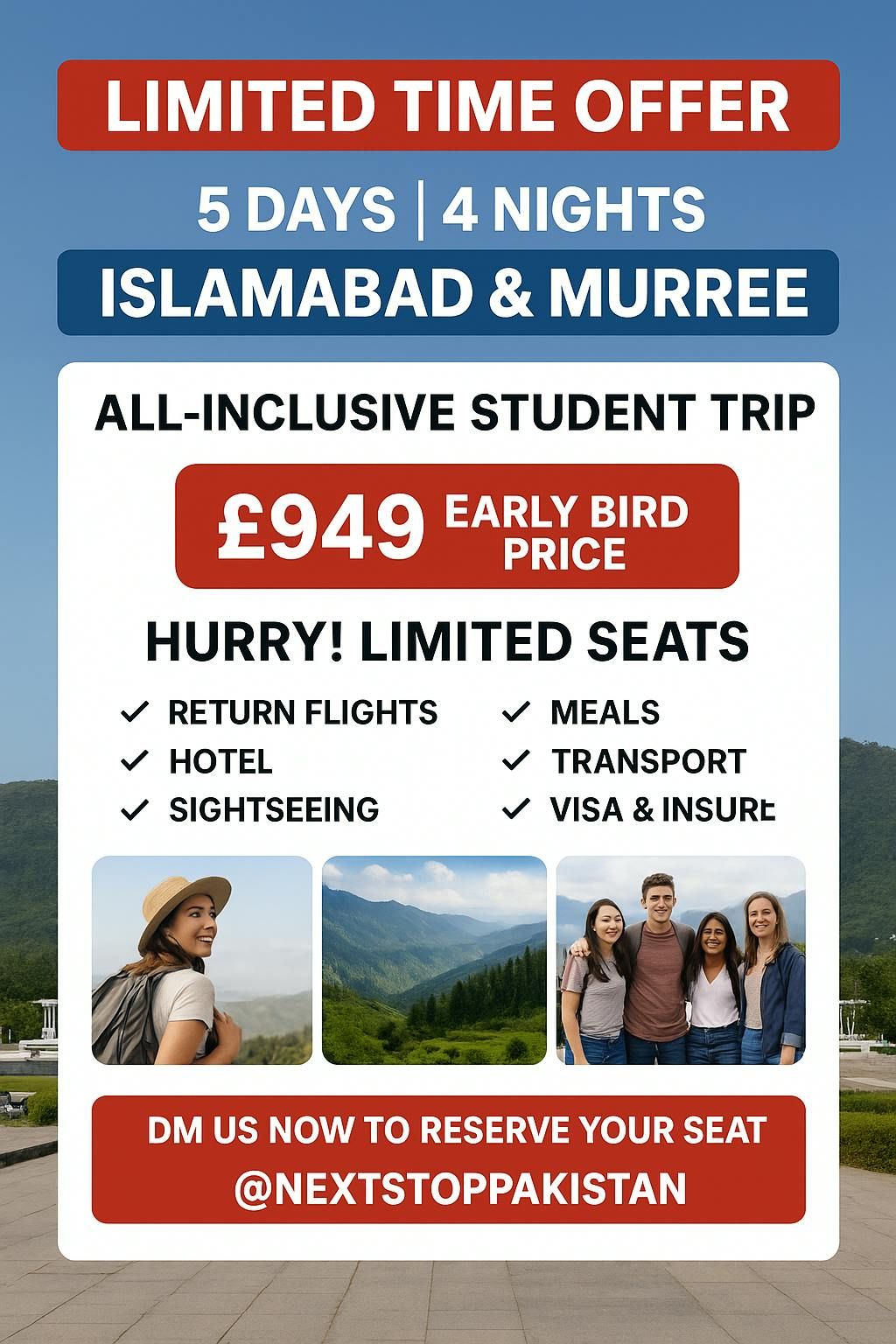 🌟 Experience Pakistan Like Never Before! 🌟Join NextStop Pakistan for an exclusive VIP student trip from 23–28 January 2025! Immerse yourself in the breathtaking beauty of Islamabad, Murree, and Peshawar while enjoying luxury accommodations, private transfers, and curated activities — all designed for students who love adventure, content creation, and unforgettable experiences.