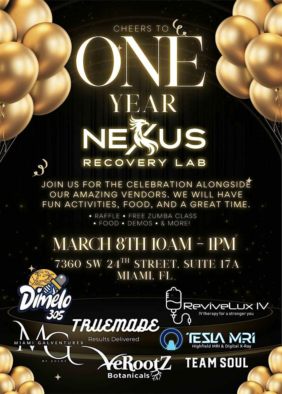 We're throwing a party to mark one amazing year of Nexus Recovery Lab! Come join us for a fun-filled celebration packed with good vibes, great company, and lots of surprises. It's the perfect chance to relax, learn about our recovery, check out our vendors, mingle, and make some awesome memories. Don't miss out on this epic meetup — let's celebrate together and make it a day to remember!