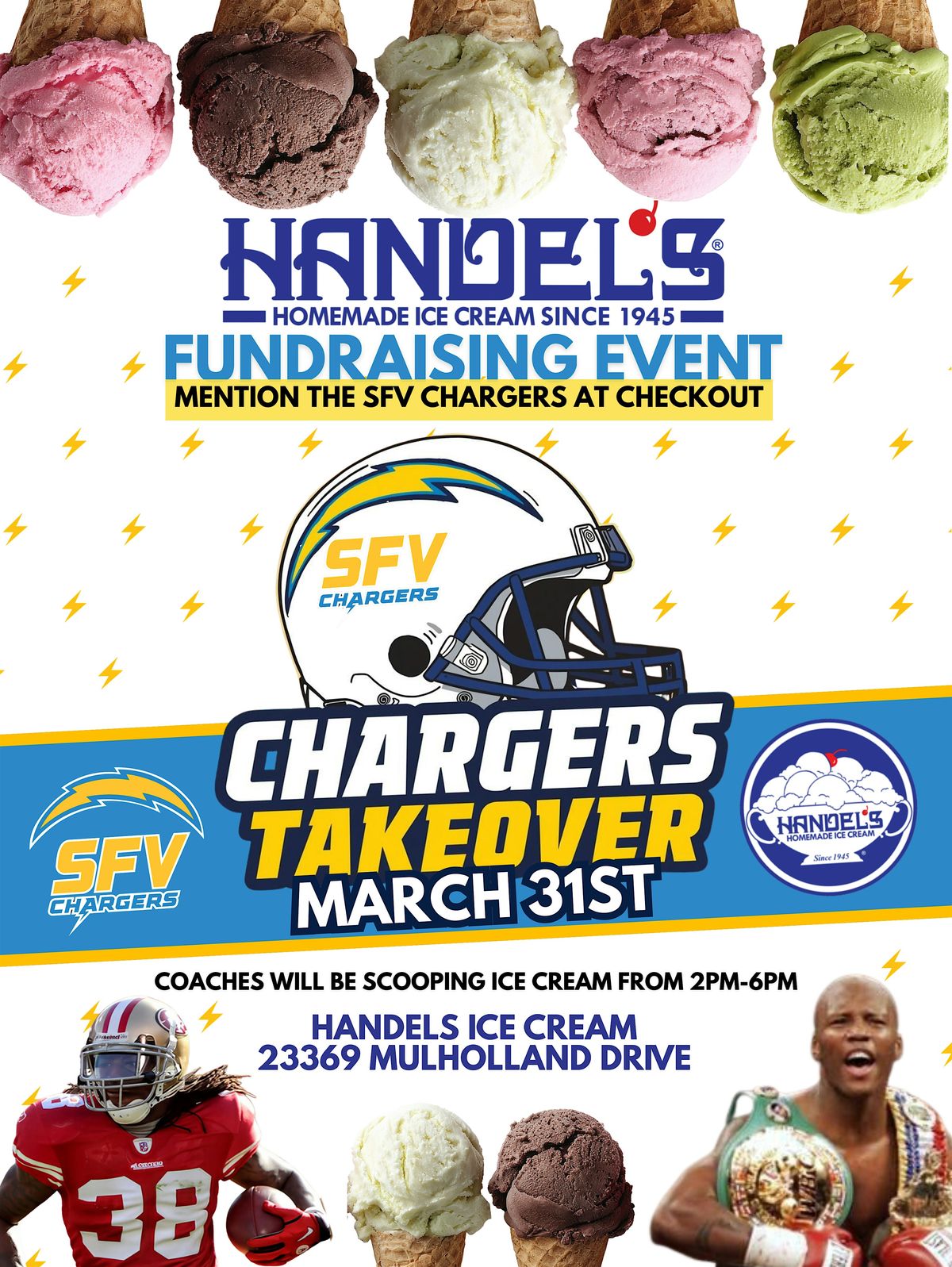 Join NFL Star Dashon Goldson & Boxing Champ Zab Judah join the SFV Chargers for a sweet fundraiser at Handel’s Ice Cream in Calabasas!About this Event