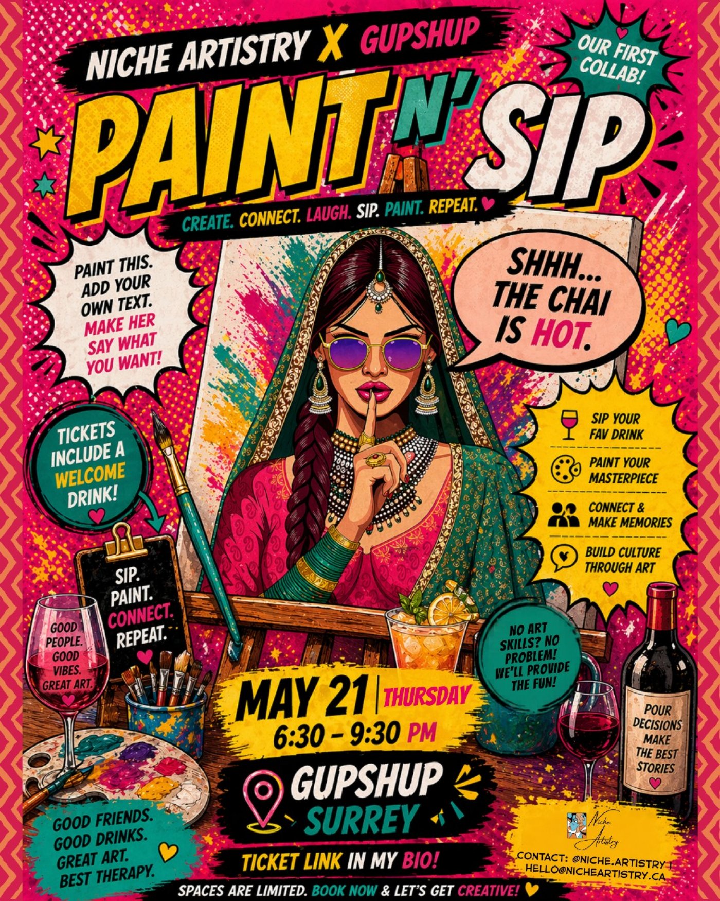 On May 21st from 6:30–9:30 PM at Gupshup in Surrey, guests will take part in a step-by-step guided paint workshop led by professional artist Nishita. Throughout the night, everyone will be painting the same themed artwork, but the fun twist is that you’ll personalise the speech bubble with your own message, making your piece unique to you.