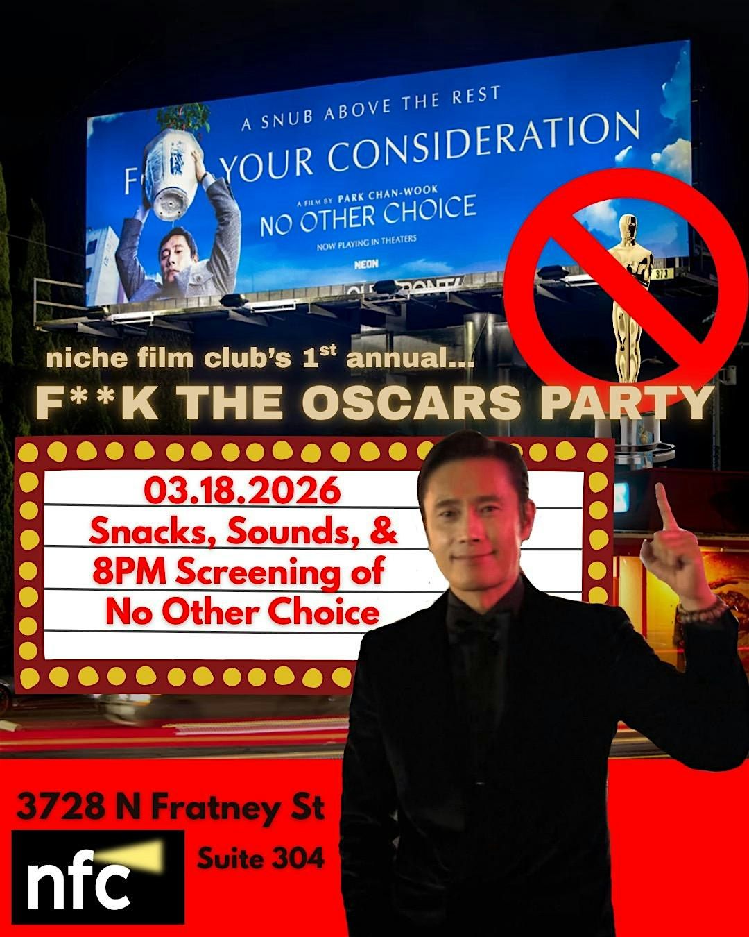 niche film club’s first annual F**K THE OSCARS PARTY! come debrief the big night with a special screening of No Other Choice. starts at 8PM