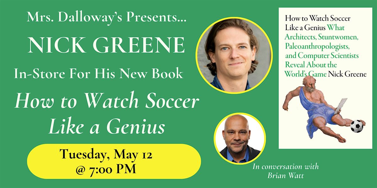 Join us at Mrs. Dalloway's Bookstore on Tuesday, May 12 when Berkeley author Nick Greene comes to the store to present his new book How to Watch Soccer Like a Genius: What Architects, Stuntwomen, Paleoanthropologists, and Computer Scientists Reveal About the World's Game. Greene will be joined in conversation by Brian Watt and will sign copies of his book after the presentation.
