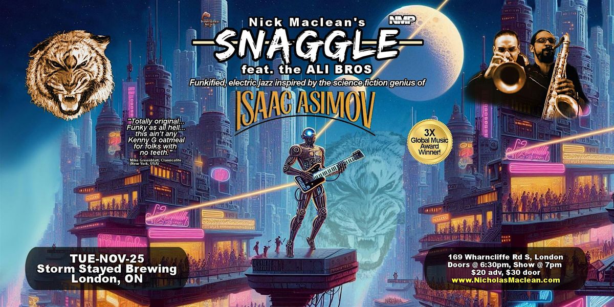 Under the leadership of JUNO-nominated and 10x Global Music Award–winning jazz pianist NICK MACLEAN, SNAGGLE feat the ALI BROS launches into a daring new chapter: a suite of electrifying works inspired by the science fiction grandmaster ISAAC ASIMOV and his legendary FOUNDATION saga. Often described as “Canada’s answer to Snarky Puppy”, the band goes interstellar using their fearless sound, likened to a cross between electric-era Miles Davis and Rage Against the Machine, to map the rise and fall of galactic empires.