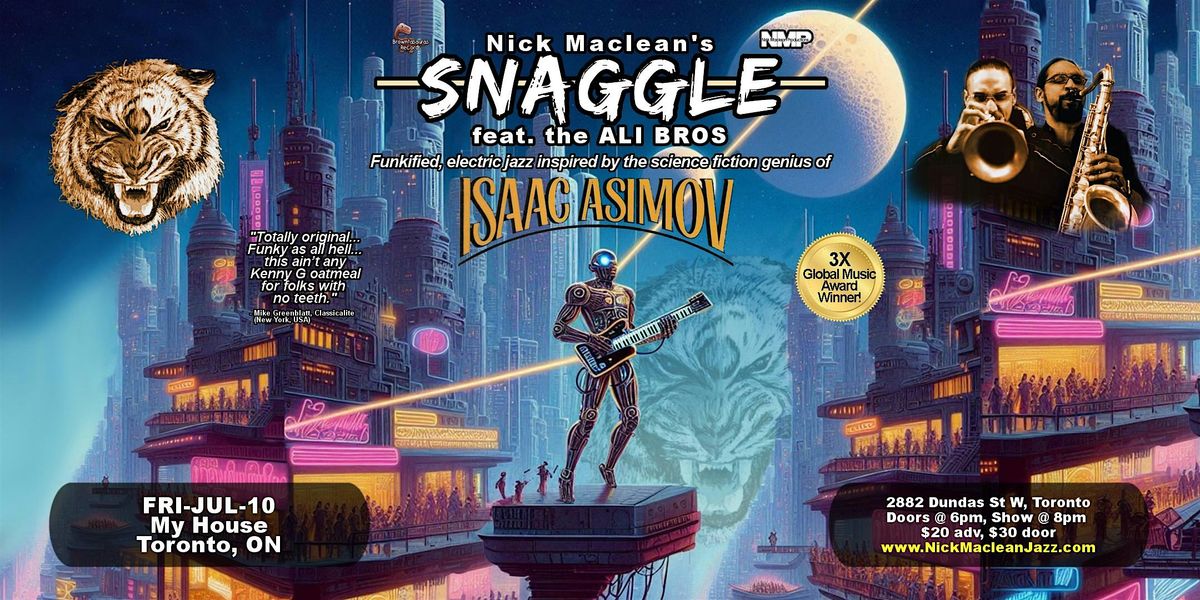 Under the leadership of JUNO-nominated and 10x Global Music Award–winning jazz pianist NICK MACLEAN, SNAGGLE feat the ALI BROS launches into a daring new chapter: a suite of electrifying works inspired by the science fiction grandmaster ISAAC ASIMOV and his legendary FOUNDATION saga. Often described as “Canada’s answer to Snarky Puppy”, the band goes interstellar using their fearless sound, likened to a cross between electric-era Miles Davis and Rage Against the Machine, to map the rise and fall of galactic empires.