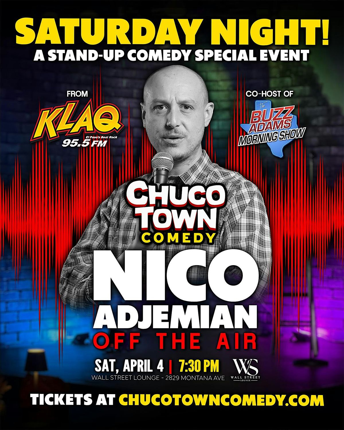 Join Nico Adjemian, one of El Paso's best comedians and the co-host of KLAQ's Buzz Adams Morning Show, Stand-Up Show "Off The Air" !