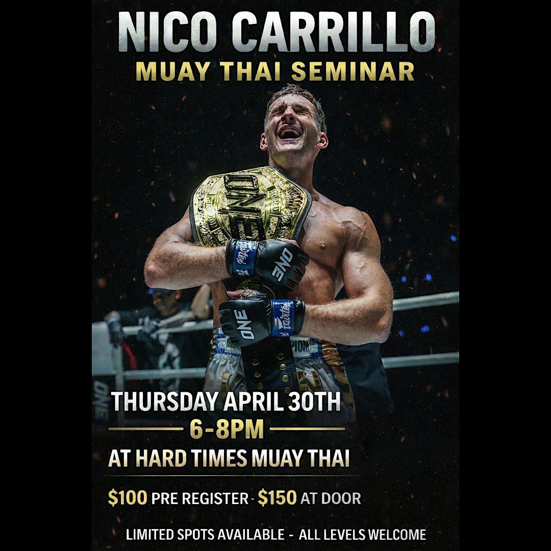 Hard Times Muay Thai is excited to host ONE Championship Featherweight Muay Thai World Champion, Nico Carrillo. With an impressive professional record of 30-4-1, Nico will bring his elite-level, world-class experience and technique to this HTMT exclusive seminar.
