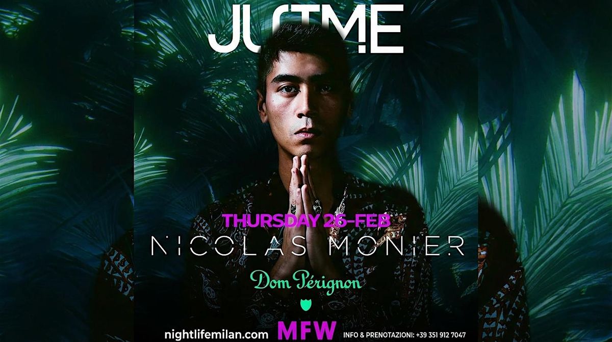 Giovedì 26/02/2026: Just Me Milano con Nicolas Monier special guest. Ingresso 15 € valido per aperitivo + club (come da pagina ticket). Tavoli VIP acquistabili online. Cena in venue prenotabile via WhatsApp.