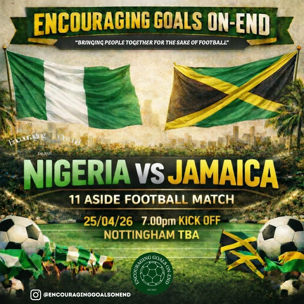 Encouraging Goals On-End⚽️ is coming to Nottingham and we’re ready to take over! We’re bringing the energy, the culture, and the love of football with an exciting Nigeria🇳🇬 vs Jamaica🇯🇲match that’s all about community, passion, and good vibes. This isn’t just a game — it’s a moment for people to come together, represent, and celebrate the beautiful game🥳. Expect big energy, competitive football, and a crowd that’s ready to make some noise.With Special Guests coming to watch and keep you guys engaged👀.