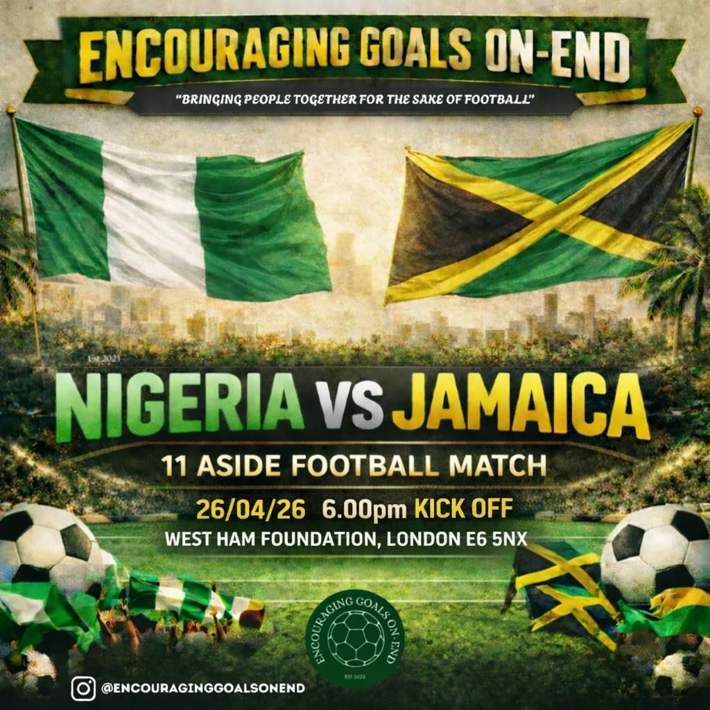 Encouraging Goals On-End⚽️ is coming back and we’re ready to take over! We’re bringing the energy, the culture, and the love of football with an exciting Nigeria🇳🇬 vs Jamaica🇯🇲match that’s all about community, passion, and good vibes. This isn’t just a game — it’s a moment for people to come together, represent, and celebrate the beautiful game🥳. Expect big energy, competitive football, and a crowd that’s ready to make some noise.With Special Guests coming to watch and keep you guys engaged👀.