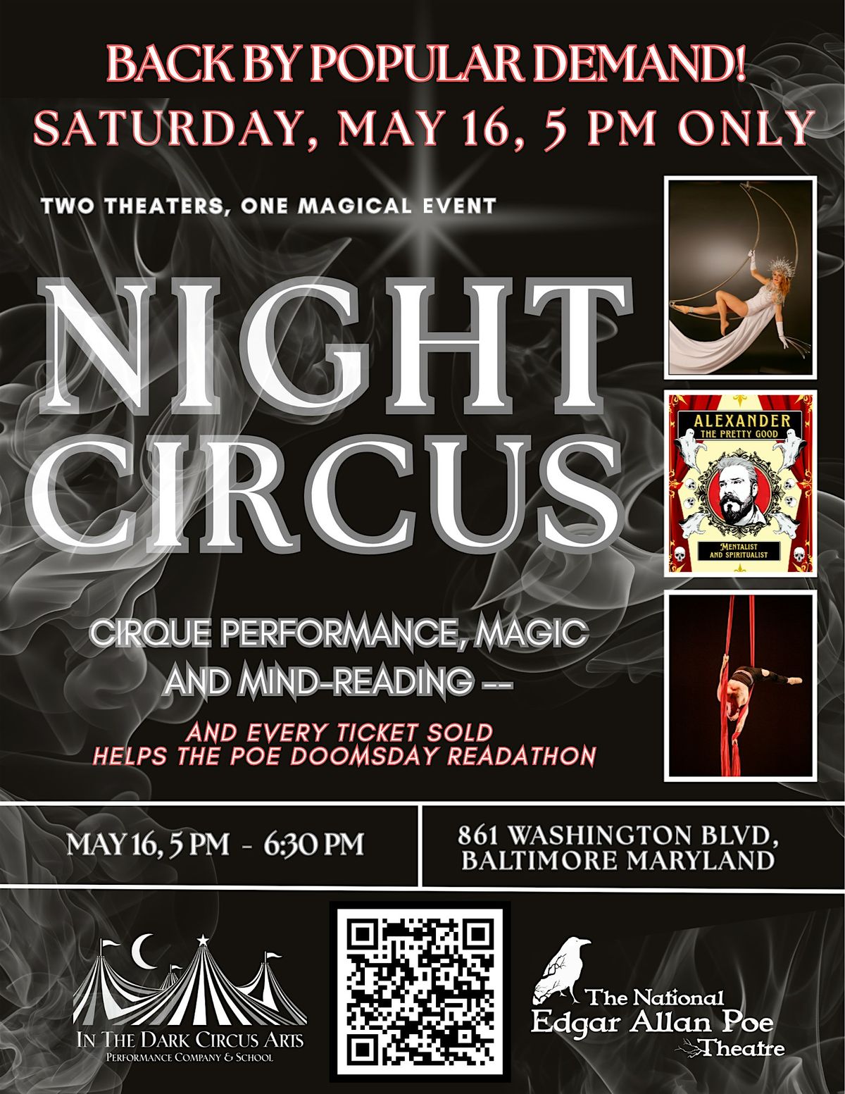 Cirque performance, magic and mind-reading come together for a fun event you’ll never forget.Performing to the words of Edgar Allan Poe, your favorite In the Dark Circus Arts talents bookend a magic and mind-reading show with their thrilling aerial fabrics, cyr wheel, moon and trapeze work. In between, The National Edgar Allan Poe Theatre’s resident above-average mind-reader Alexander the Pretty Good will pick your brains with his fun, funny and sometimes plain weird magical skills.A portion of the ticket sales will be donated to Doomsday 2026 – Baltimore’s Fifth Annual Non-Stop Reading Marathon of the works of Edgar Allan Poe. This 24 hour reading marathon is hosted this year at In the Dark Circus Arts, starting outside at noon on May 16, and continuing uninterrupted straight through until noon on May 17. A percentage of every ticket sold will be donated to the Doomsday event.