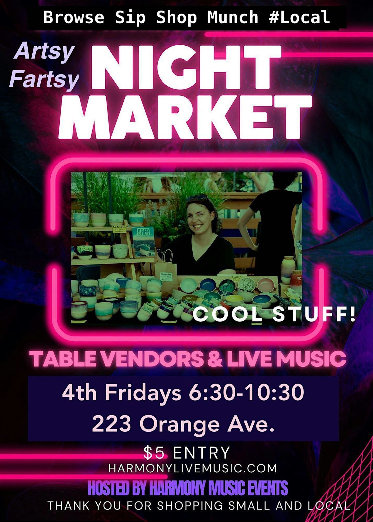 COME TO 223 ORANGE AVE. in historic Downtown Fort Pierce, surrrounded by eateries and bars. Stroll the downtown and pop into our NIGHT MARKET - with table vendors and artists offering their wares. Coffees, Teas, Gourmet Sodas, health beverages, NA beer and wine and all sorts of drinks including MOCKTAILS available. Thank you for telling friends and supporting these Treasure Coast creators. Always on the 4th Fri. of the month from 6:30 to 10:30 at Priscilla's Oasis on Orange FREE PARKING GARAGE A HALF BLOCK WEST OF THE VENUE