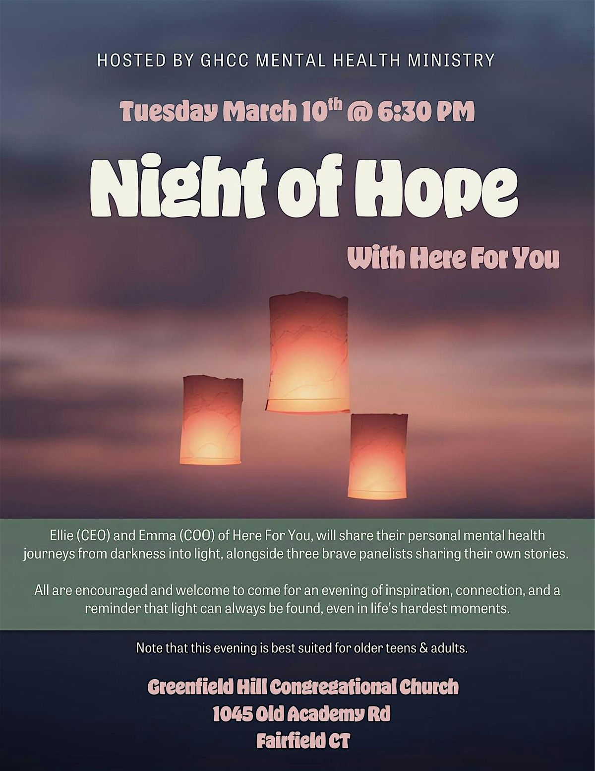 Join us for a Night of Hope, presented by Here For You and hosted by GHCC Mental Health Ministry (Shalom Ministry) at Greenfield Hill Congregational Church.