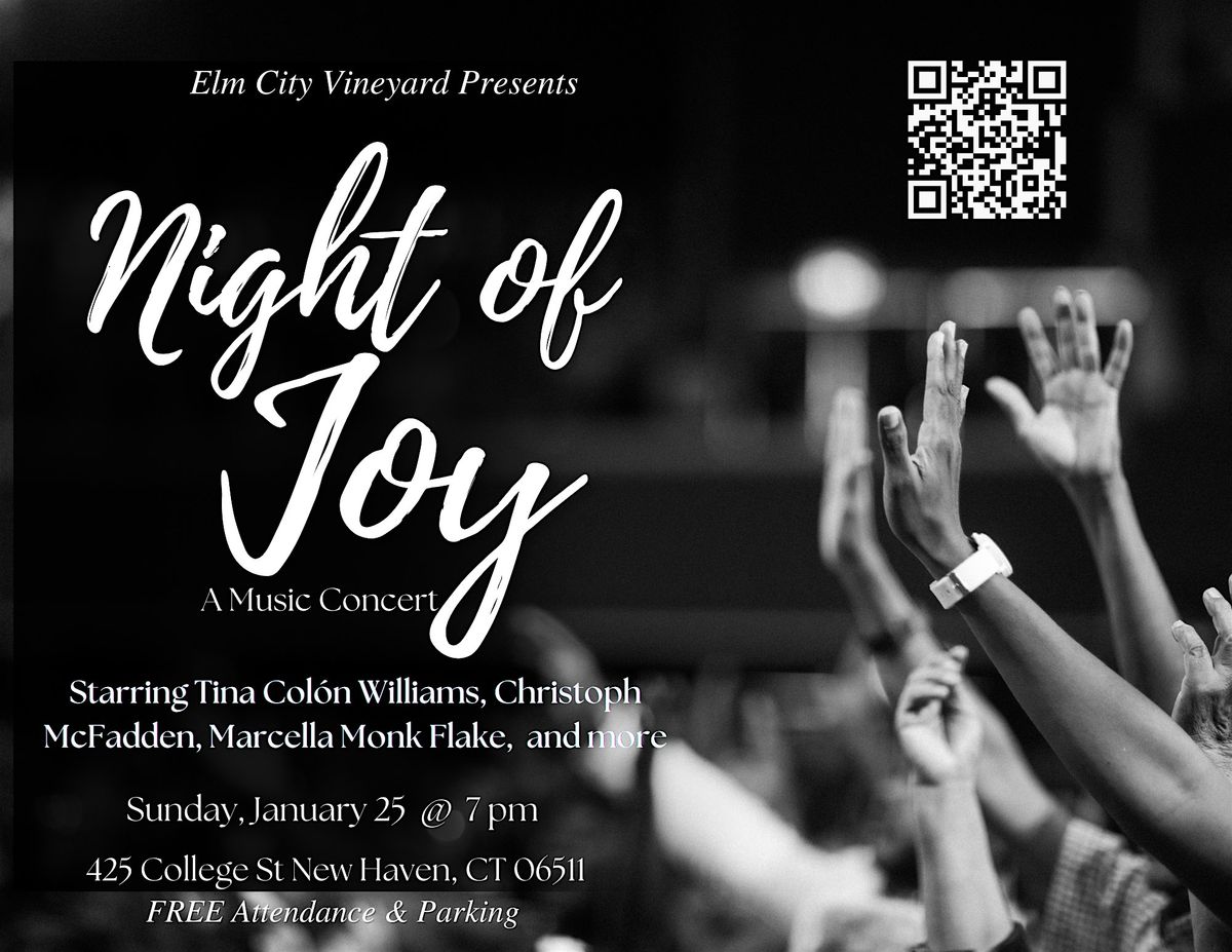 Welcome to Night of Joy: A Music Concert! Join us at Elm City Vineyard Church on TBD at 7:00 PM for a night filled with incredible music and joy. Get ready to immerse yourself in a sea of melodies and rhythms of song that you know that will lift your spirits and make your heart sing. This event promises to be a memorable experience that you won't want to miss. Mark your calendars and come enjoy the night with us!