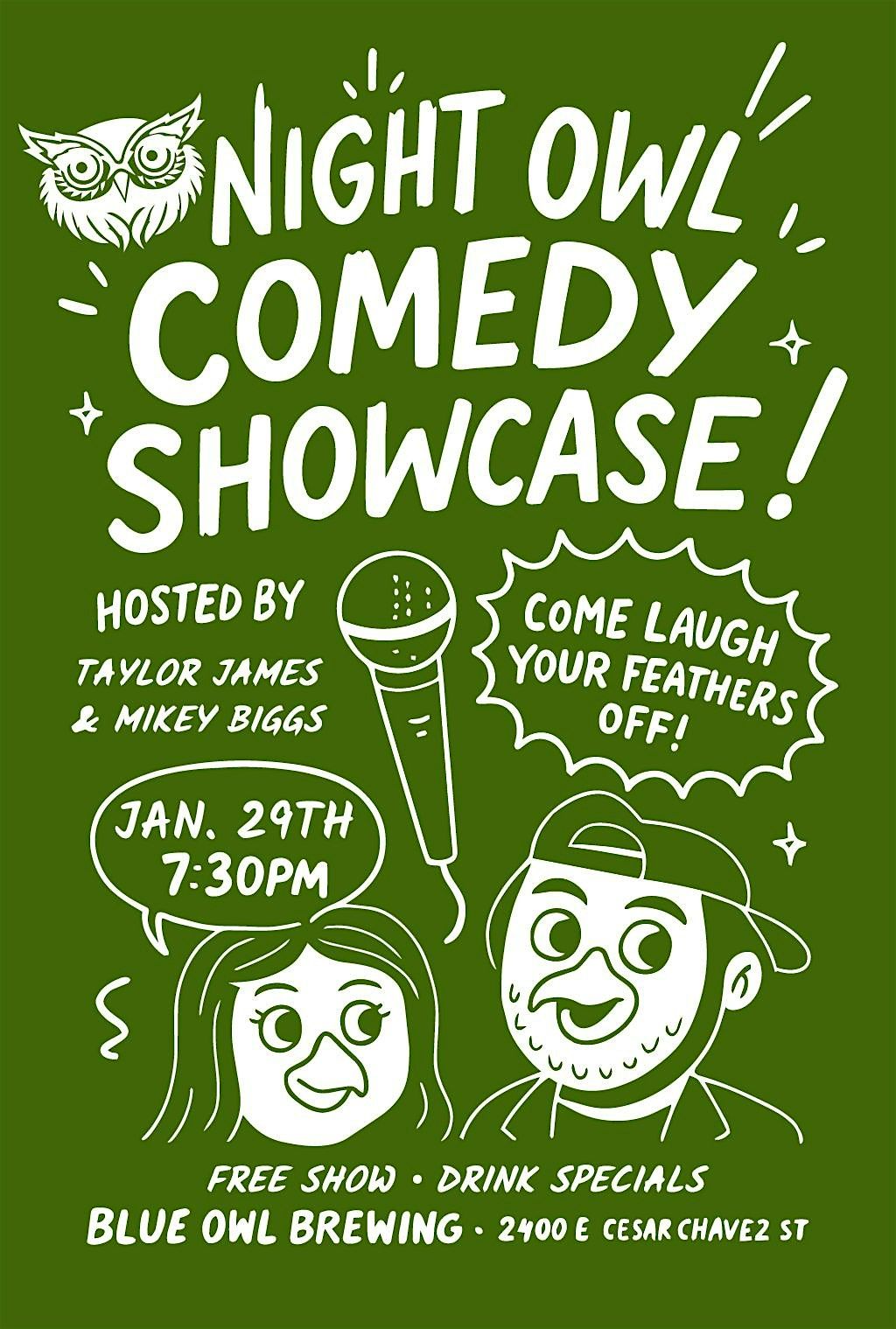 Come laugh your feathers off at Night Owl Comedy Showcase! See some of Austin’s funniest at Blue Owl Brewing on November 20th at 7:30pm!