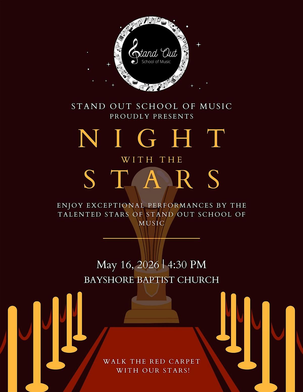 Step into a world of starlit melodies at Stand Out School of Music's Night with the Stars recital! Join us on May 16th, 2026, at 4:30p.m. for an extraordinary showcase of musical talent that will leave you mesmerized.