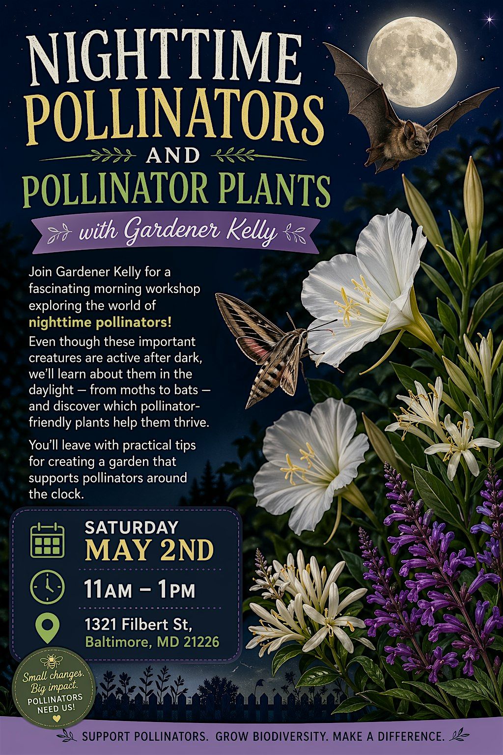 Join us at 1321 Filbert St on May 2, 2026 at 11:00 AM (Eastern Time) for a fun and casual look at nighttime pollinators and the plants they love. Discover which creatures come alive after dark and how you can help support them in your own garden. Whether you're a nature newbie or a plant pro, this event is a great way to learn and connect with fellow pollinator enthusiasts!