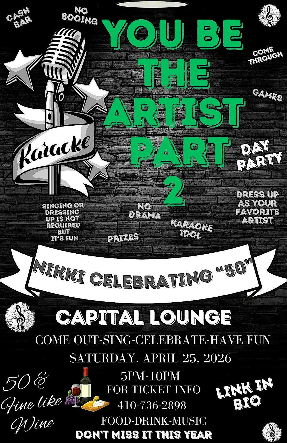 Nikki\u2019s, 50 and Fine like Wine , You be the Artist Karaoke Party Part 2 Dressing up as your artist or singing is not required but is fun. What’s required : positive vibes, energy and crowd participation!!