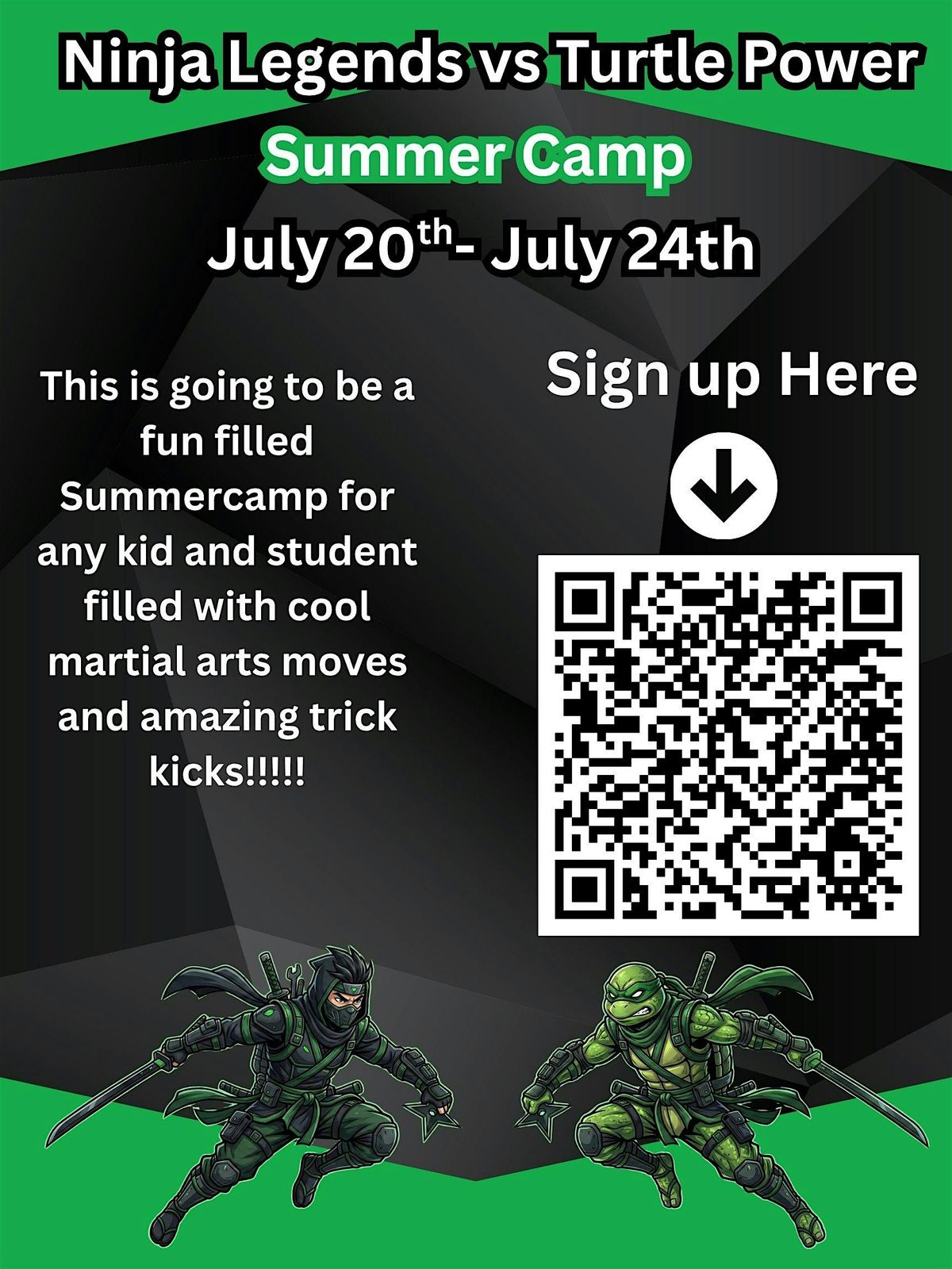 Dates: July 20th β July 24th Cowabunga! π’ Itβs a clash of the titans as we bring the skills of the Ninja Legends to life. This camp is all about speed, stealth, and high-flying movement. Summer Camps run Monday-Friday 8am-4pm. Ages 5-12 yrs old. Campers bring water bottle and sack lunch daily. Camps are $199 a week you pay a $50 deposit today and the rest is due the friday before your camp starts.