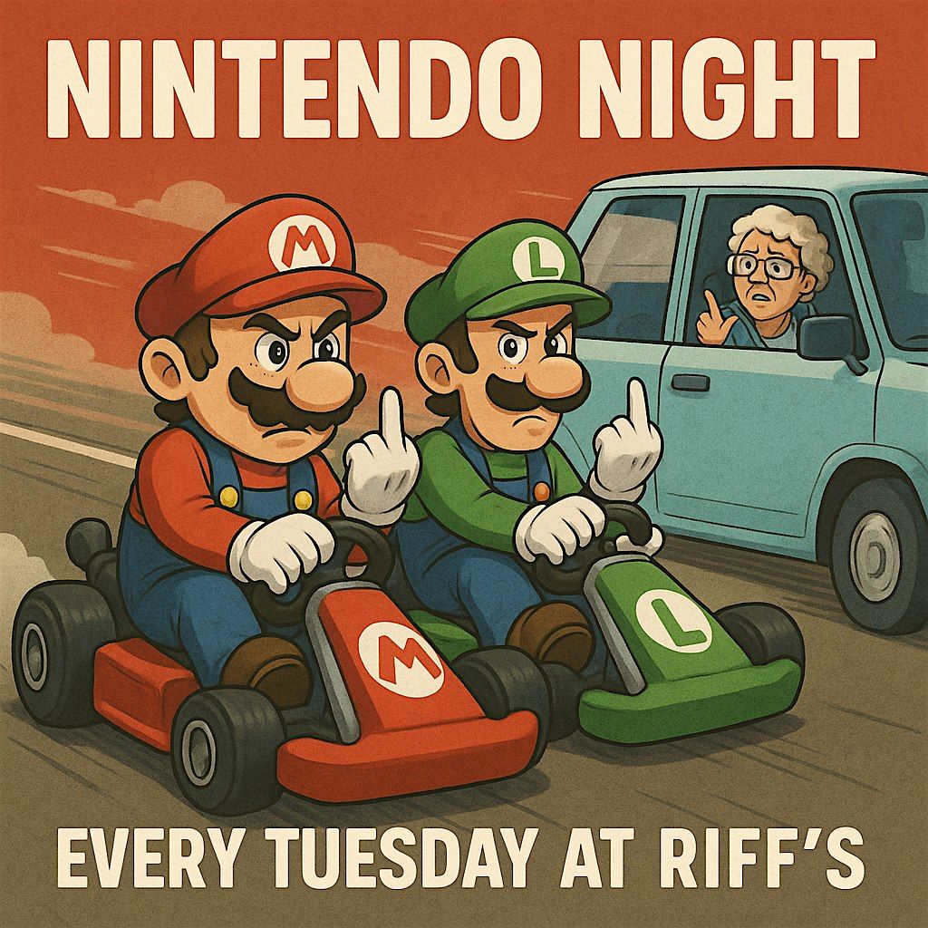 We’re firing up the projector and dusting off the classics. Grab a drink, grab a controller, and get ready to talk trash like it’s 1999. We’ll have old-school Nintendo games up on the big screen, from Mario Kart to Smash Bros, winner gets bragging rights and maybe a shot. It’s game night, Riff’s style.
