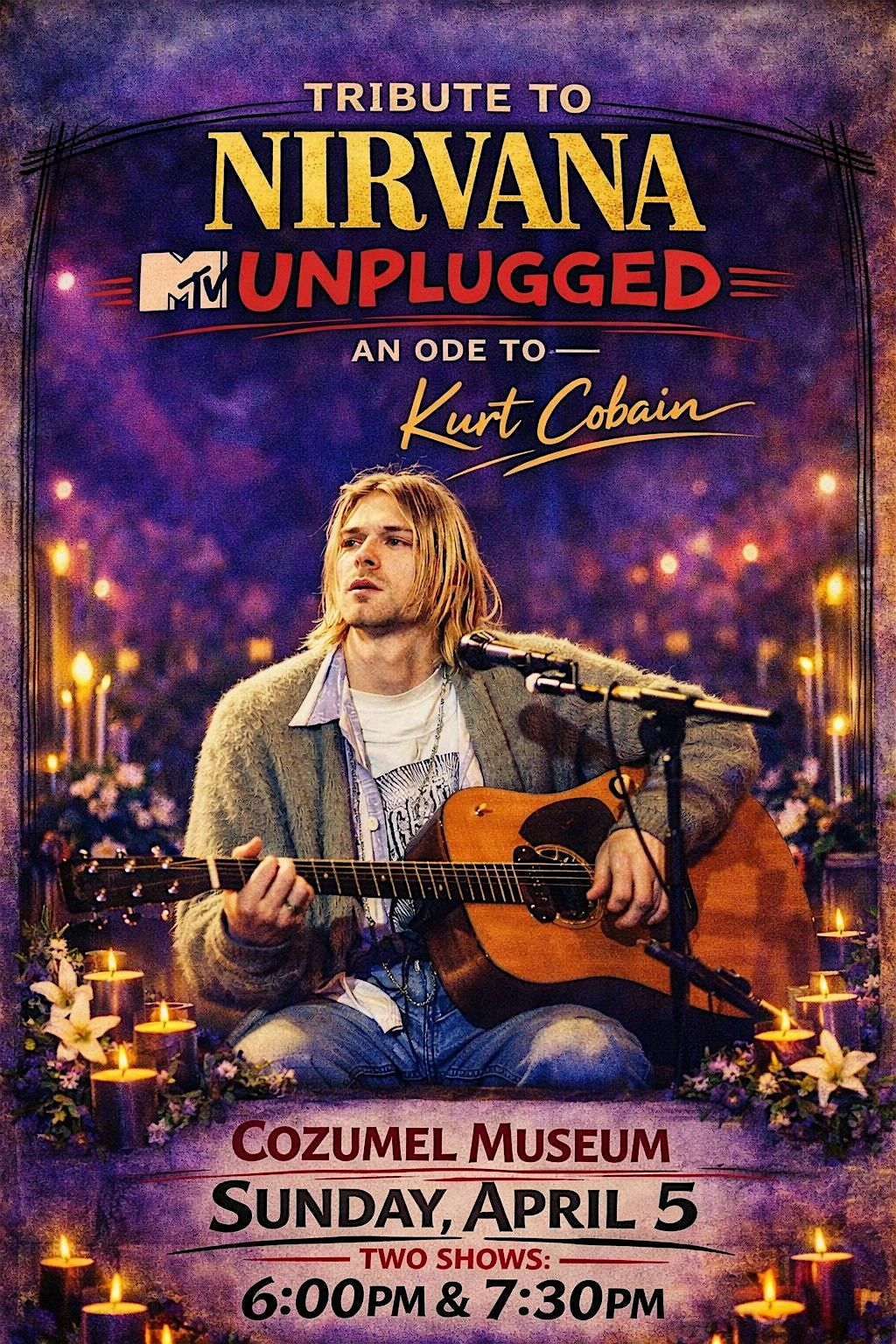 Nirvana Unplugged: Ode to Kurt Cobain recreates the iconic MTV Unplugged performance with a carefully crafted atmosphere inspired by the original session — warm lighting, candles, acoustic arrangements, and raw emotion.