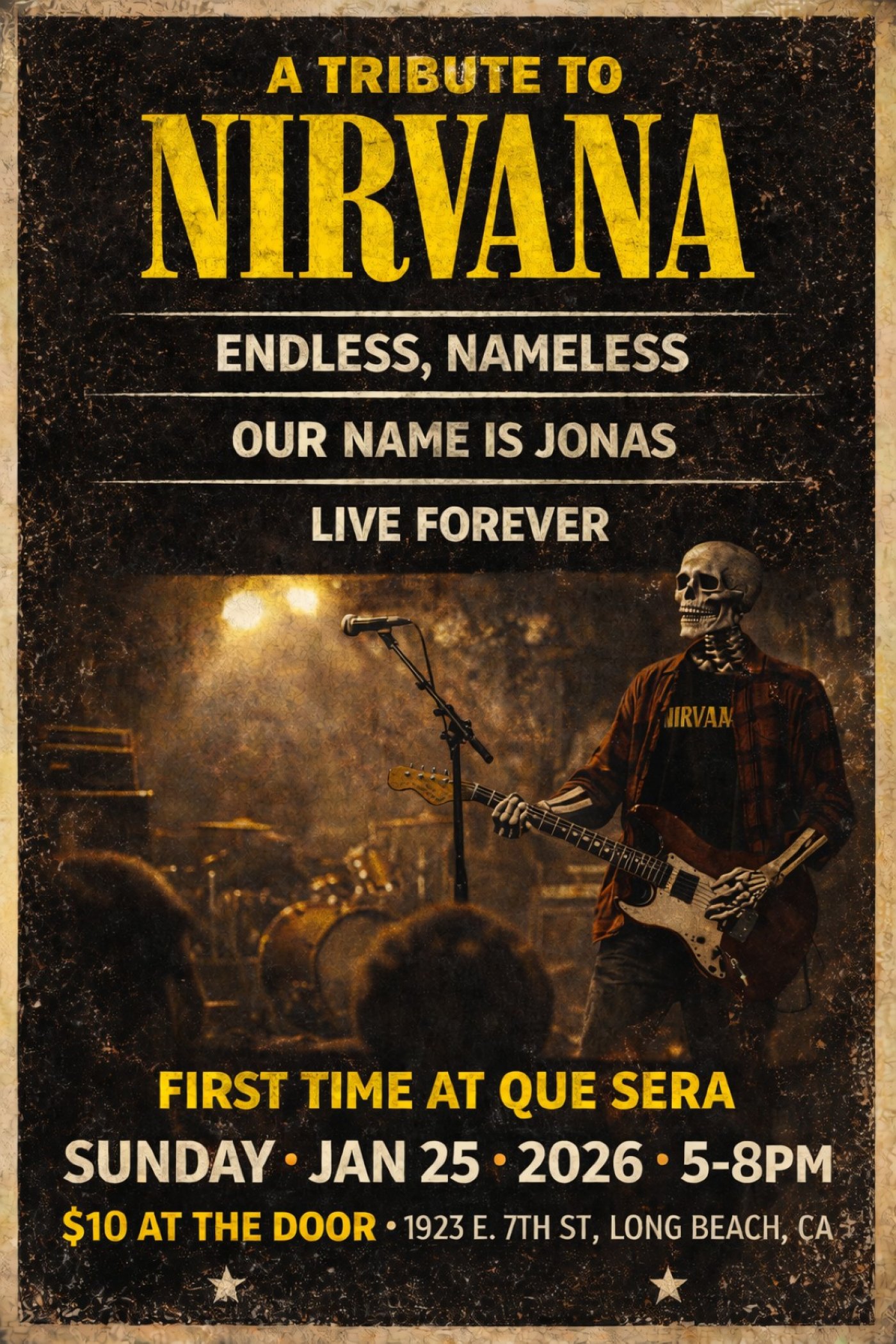 Endless, Nameless returns to Long Beach for a special Sunday matinee at Que Sera, joining forces with Our Name Is Jonas (Weezer tribute) and Live Forever (Oasis tribute) for an afternoon of iconic ’90s alternative rock.