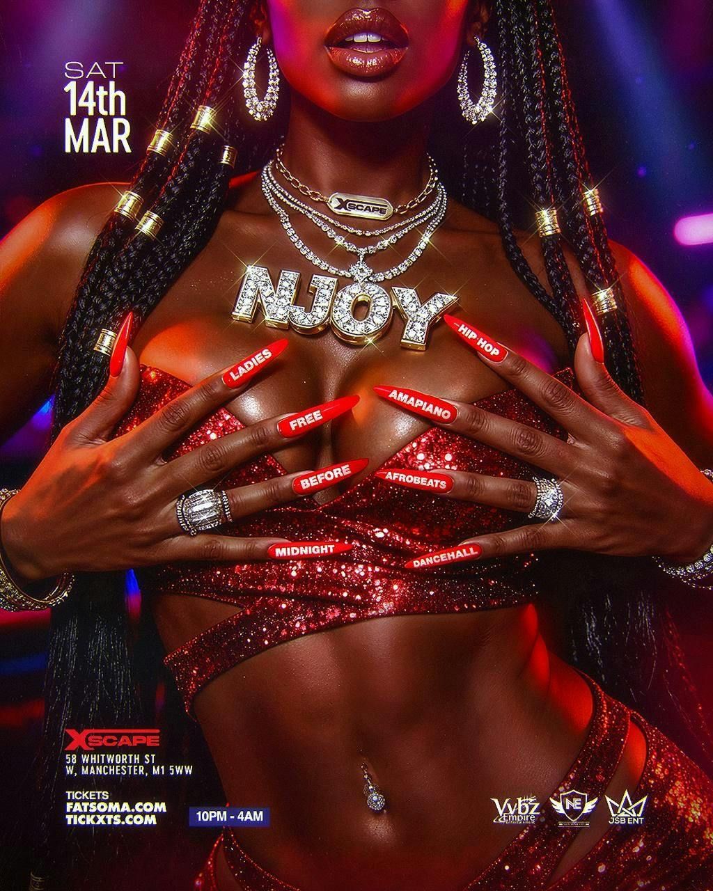 Get ready to NJOY a night built for pure vibes, big energy and non-stop movement as Xscape Manchester comes alive with the best of Afrobeats, Hip-Hop, Amapiano, RnB and Dancehall. Expect premium sounds, a lively crowd and an electric atmosphere from 10pm till 4am. Whether you’re coming to dance, turn up with friends or celebrate in style, this is the Saturday night you don’t want to miss.? Venue: Xscape Manchester, 58 Whitworth Street West, M1 5WW⏰ Time: 10pm – 4am? Enquiries & Tables: 07709884845? NO ID, NO ENTRY