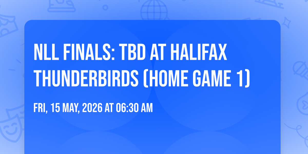 📍 Location: 44.6483, -63.5768🌟 Be part of history at NLL Finals: TBD at Halifax Thunderbirds (Home Game 1), an extraordinary gathering that will captivate your imagination! 🏛️ The prestigious Scotiabank Centre in Halifax, NS sets the stage for an unforgettable experience on May 15th, 2026 at 06:30 AM. ✨ They are bringing together the finest elements of entertainment and innovation to create moments that will take your breath away. From the moment you arrive, you'll be immersed in an atmosphere of wonder and excitement. 🎯 This carefully planned event ensures every guest experiences something truly special. 🎊 Early booking is recommended for this must-attend event of the season!